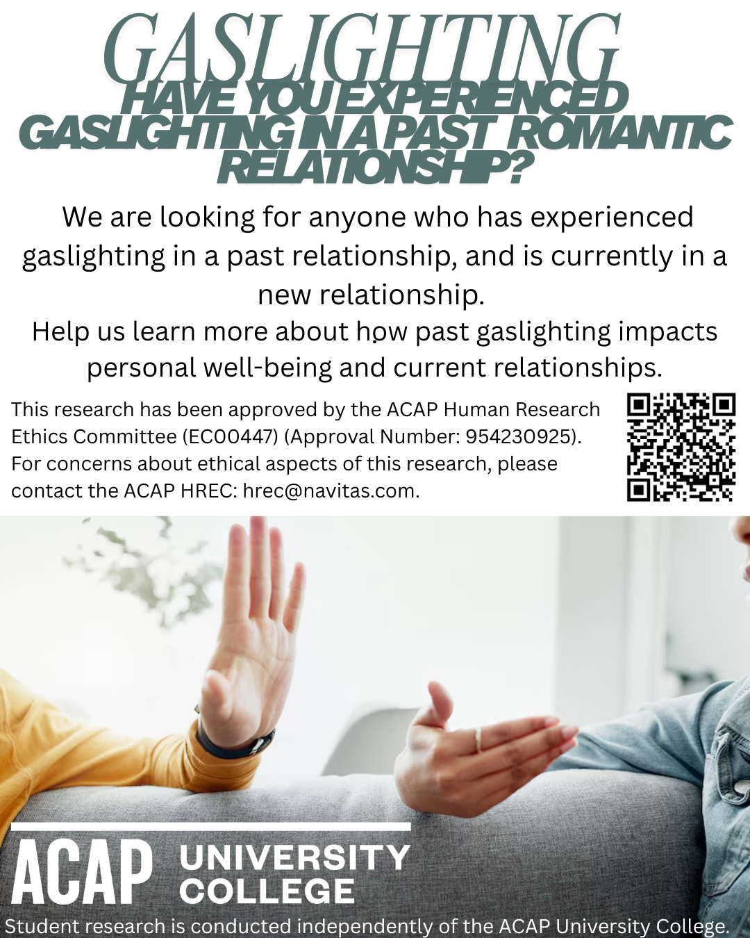 You are invited to take part in a study that is exploring how the experience of gaslighting in a previous relationship is perceived to have affected current personal and relationship well-being through the mechanism of self-concept clarity. Gaslighting is a relational dynamic in which one person repeatedly manipulates another, causing them to question their thoughts, memories, perceptions, and even their own mental stability. The experience of gaslighting, then, may affect the extent to which we possess a clearly defined and stable sense of self, which in turn may affect our own subsequent personal well-being and the well-being of any later relationships. Although gaslighting is increasingly recognised in media and public awareness campaigns, there is little research on how it affects both self-identity, life meaning, and later romantic relationship experiences. This study seeks to better understand these effects by hearing directly from adults who may have experienced gaslighting from a romantic partner.